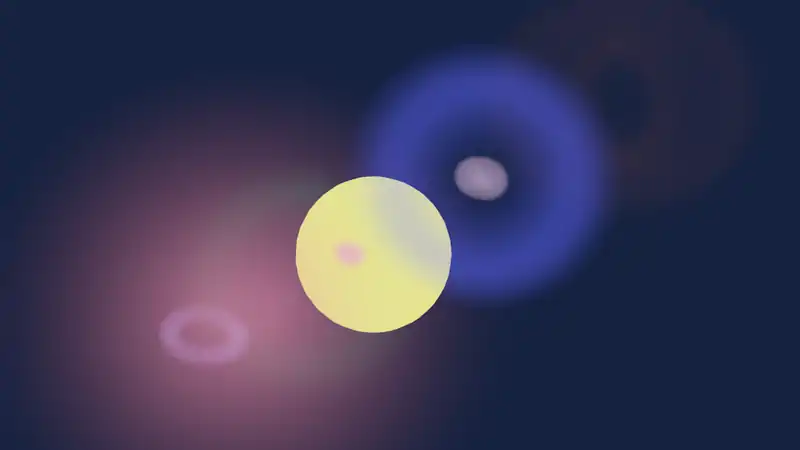 A halo material can also produce a flare effect. This is the “lens flare” that happens when a physical camera is aimed at a very bright light source; the spillage of light bouncing around inside the optics produces coloured rings and other interesting artifacts on top of the image. This has become such an accepted part of photography that computer graphics programs like Blender, which do not suffer the imperfections of physical lenses, go to a great deal of trouble to offer a realistic flare effect.