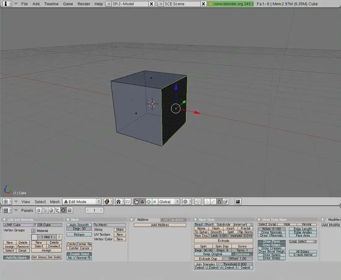 If you look at the bottom border in this example, you can see four new buttons to the right of the magnet button. As you saw in the previous section, a mesh has Vertices, Edges, and Faces. Each button corresponds to the button's picture. In Edit Mode, you can manipulate and transform these three types as you choose, using the transformation buttons. Try it. Just free-wheel it for now, making sure to select with RMB. Now RMB-drag to move the selection. (You can let go of RMB once you start the movement. Finally, either click LMB to keep the change, or click RMB to ignore the change. Change the selection types by pressing the Vertices, Edges, or Faces buttons in the bottom border area so you can choose the parts of the cube you want to select. Also you can select with these different ways, so practice them: