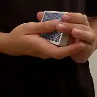 4. Begin to move the left hand to the right and downwards so that the packet of cards in the right hand goes behind those in the left. The right thumb should contact the top of the lefthand packet as before.