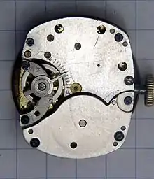 Base movement Model 24 has an oval-rectangular dial plate, and a mostly circular back plate, with a flat at 2:00. Balance is at 5:00. First used in 1963, continued with minor modifications until mechanical production ended.