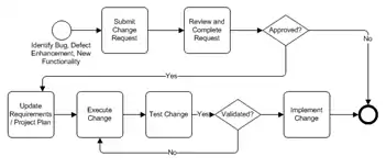 A simplified process that might be used for managing changes is illustrated in the Change Management Process diagram at right. Information about the change, including scope, feasibility, costs, benefits and impacts to existing requirements and technical architecture, will be needed for the approver review. Specific designees will be responsible for approving changes.