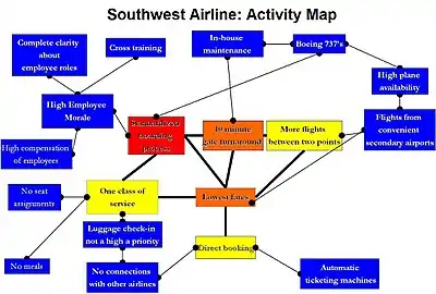 An activity map shows how a company creates value in a competitive market (Morgan et al. 2007). The map shows which activities a company must align to generate value in the market. Activity maps identify the most critical activities needed to achieve strategic objectives and the investments necessary to support these activities. Creating the map requires focusing on the most important activities while putting less important actives to the side. The final map allows us to determine what projects, programs and activates are critical for a company to achieve its strategic objectives. The goal is to identify important activities so that it will be possible to develop ways to measure how well the company is performing these activities. An example of an activity map for Southwest Airlines appears below.