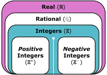 The real numbers include all the sets we talked about in this section. That means it includes the integers, the rational numbers, and the irrational numbers. The following image to the left denotes the sets that will be relevant to your studies for now.