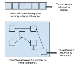 allocates given byte-block in linear order. It requires continuous block of memory.HeapAlloc
