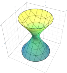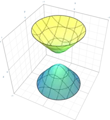 A cylinder is a surface that consists of all lines that are parallel to a given line and pass through a given plane curve. There are several special cylinders such as the parabolic cylinder and the circular cylinder. For example, the image on the right is a parabolic cylinder. Parabolic cylinder typically has an equation of: