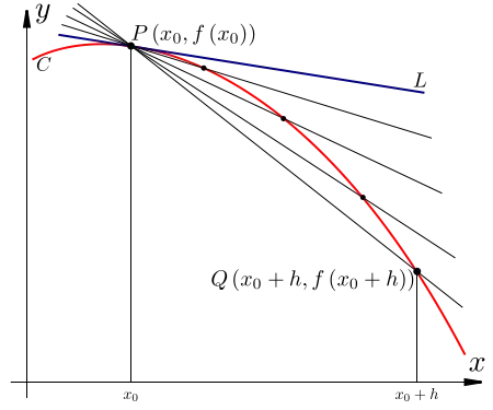 The definition of the tangent line we gave was not rigorous, since we've only defined limits of numbers — or, more precisely, of functions that output numbers — not of lines. But we can define the slope of the tangent line at a point rigorously, by taking the limit of the slopes of the secant lines from the last paragraph. Having done so, we can then define the tangent line as well. Note that we cannot simply set to 0 as this would imply division of 0 by 0 which would yield an undefined result. Instead we must find the limit of the above expression as tends to 0: