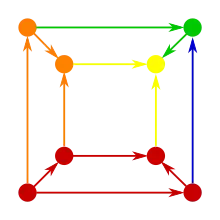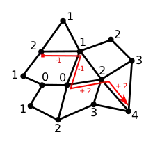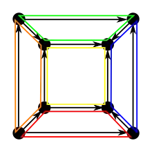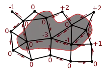 The discrete analog to oriented surfaces using a directed graph is that an oriented surface is a collection of edges and orientations: where all of the edges are distinct and is an indicator that describes the surface's orientation. Each edge is an edge that passes through the surface, and is if passes through the surface in the preferred direction, and is if passes through the surface in the opposite direction. The combined surface denoted by is (surface is surface with the orientation reversed) and the total area is .