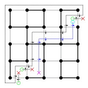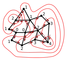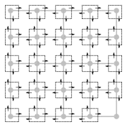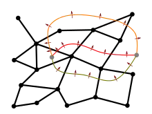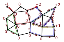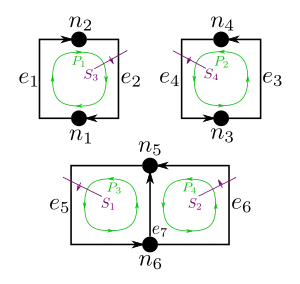 ![]() A directed graph that will be used to model the electric and magnetic circuits, along with chosen basis loops and their corresponding surfaces. |