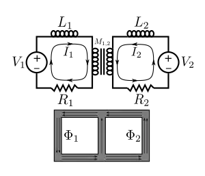 - The left image depicts a circuit diagram that denotes the circuits that are the subject of this example. Each loop consists of a voltage source in series with a resistor, and a self inductance followed by a mutual inductance. At the bottom of the image, the "magnetic circuit" is shown. The magnetic circuit carries magnetic flux instead of electric current, and helps to quantify the self and mutual inductance between the two loops of current.