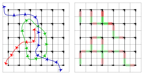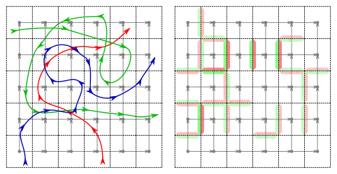 Below is shown two examples of a multi-path and the corresponding edge based function . On the left a superposition of multiple paths is shown. For each surface , the total "flow" through is computed and is then divided by to spread it out over the surface . On the right, the flow enters a surface through the green side and leaves through the red side. The density of the flow is depicted by the strength of the shading. If the green to red orientation coincides with the orientation of , then is positive. If the green to red orientation is opposite the orientation of , then is negative.