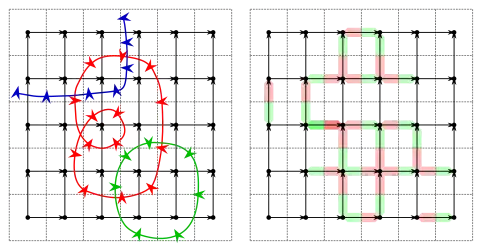 - A non-closed surface, shown in blue, is the linear superposition of basis non-closed surfaces and a closed surface. Observe how the blue arrows on the edges are the sum of the black arrows (opposites cancel out).