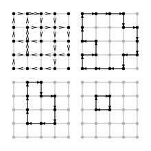 Start by choosing an arbitrary simple loop from . Add loop to . For as long as there are nodes or edges in that are not contained by or , find an arc that starts and ends at nodes from . With the exception of the starting and ending nodes, arc must not visit a node or edge from or . The end nodes of can be linked by a path through the nodes and edges from and to form a simple loop that is then added to .