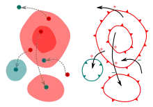 Below is shown two examples of a multi-surface and the corresponding edge based function . On the left a superposition of multiple surfaces is shown. For each curve , the net number of times edge penetrates in the preferred direction, referred to as the "gain" across , is computed and is then divided by to spread the gain out over the curve . On the right, the net gain is positive if an edge is traversed from the green end to the red end. The amount of gain is depicted by the strength of the shading. If the green to red orientation coincides with the orientation of , then is positive. If the green to red orientation is opposite the orientation of , then is negative.