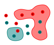 Below is shown two examples of a multi-point and the corresponding node based function . On the left, there is a collection of points with a weight of +1 denoted by red dots, and points with a weight of -1 denoted by blue dots. For each volume , the weights of all of the contained points are added together and the total weight is divided by to spread it out over the volume . On the right, shades of red denote positive values for , while shades of blue denote negative values for . White means that for the current node .