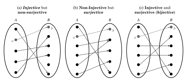 There is one more final aspect that needs to be defined. We already have a good idea of what makes a mapping a function (e.g. it cannot be one-to-many). However, three more definitions that you will often hear will be necessary to talk about: injective, surjective, bijective.