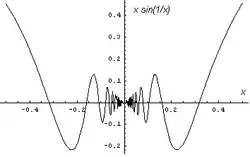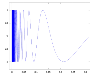 - As gets closer to 0 the function keeps oscillating between and 1. In fact, oscillates an infinite number of times on the interval between 0 and any positive value of . The sine function is equal to 0 whenever , where is a positive integer. Between every two integers , goes back and forth between 0 and or 0 and 1. Hence, for every . In between consecutive pairs of these values, and , goes back and forth from 0, to either or 1 and back to 0. We may also observe that there are an infinite number of such pairs, and they are all between 0 and . There are a finite number of such pairs between any positive value of and , so there must be infinitely many between any positive value of and 0. From our reasoning we may conclude that, as approaches 0 from the right, the function does not approach any specific value. Thus, does not exist.