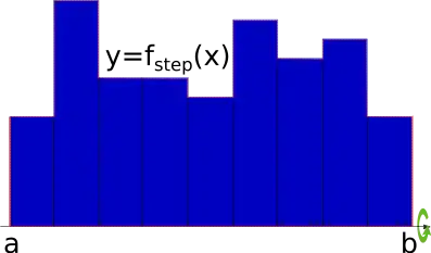 Consider the solid formed by revolving the region bounded by the curve , which is continuous on , and the lines , and around the -axis. We could imagine approximating the volume by approximating with the stepwise function shown in figure 2, which uses a right-handed approximation to the function. Now when the region is revolved, the region under each step sweeps out a cylinder, whose volume we know how to calculate, i.e.
