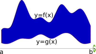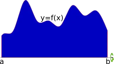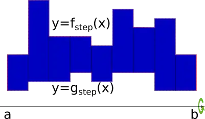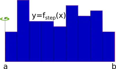 Consider the volume of one of the cylinders in the approximation, say the -th one from the left. The cylinder's radius is the height of the step function, and the thickness is the length of the subdivision. With subdivisions and a length of for the total length of the region, each subdivision has width