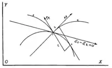 The straight line whose equation is divides the plane into two halves ; for the points of one-half, , and for the other half, . The point 1 which the curve has in common with the boundary can move only along the boundary. If the direction of the tangent to the boundary at the point 1 was different from the direction of the straight line , which may be called the dividing line, then by sliding the point 1 in opposite directions the quantity would be either positive or negative ; and since this quantity (neglecting a constant factor) is the distance from the dividing line, it is seen that it becomes infinitely small of the first order with so small that