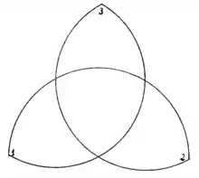 Thus we may at least determine whether or not a certain formation of the curve satisfies the problem. For example, a curve is required to pass in a definite order through the points 1, 2 and 3 and which having the smallest possible perimeter is to inscribe a given surface area. The curve in question consists of three portions which pass through 1 and 2, 2 and 3, 3 and 1. These portions are the arcs of circles with equal radii, if the given surface area is sufficiently large. This radius is to be determined from the given value of the surface.