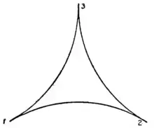 But if the surface area is greater or smaller than , then the arcs of circles must be drawn outward or inward. If, however the area is very small, we cannot draw arcs of circles so as to inclose this area without crossing one another, and we do not admit into consideration the areas that are described in the opposite directions.