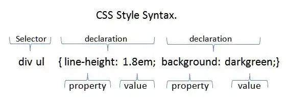 - Style-sheet formats have some common features.. Figure 1 shows a typical style-block layout that might exist in a style-sheet. In it, a selector is the main label for a set of style declarations, each of which is comprised of a property and a value. In the example, a style-sheet's selector called div ul has two style declarations; one property for line-height has a value of 1.8em; another property for background has a value of darkgreen. The number of possible selectors is not limited to single tag names, since, as in the example, these can be compounded to denote the nesting of one set of tags within another. In the example, this selector applies its styles to every unordered list that is nested within a set of division (div) tags, but not to other examples of unordered lists that it finds. The introduction of classes and id's can add even greater specificity to selector use.
