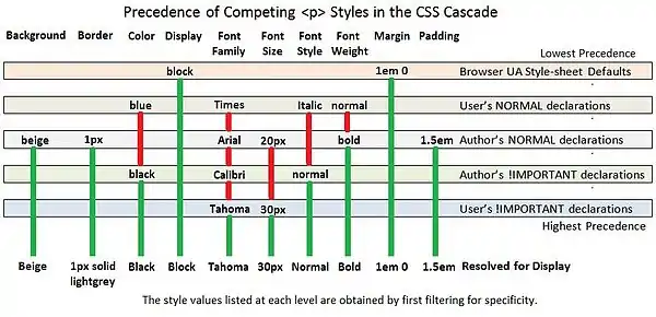 - Notice that in the above hierarchy the user's styles with the !Important keyword marking are given the highest priority of all, and that they can only fail by omission. That is to say, other styles can be used but only when a format was not specified there. In general the styles selected to represent an origin-level in the cascade can only impose on the eventual outcome if no source that is ranked above it in importance has set a value of its own. This is displayed by the graphic of Figure 3 in a more intuitively way than the sorting table, but it shows the same example.