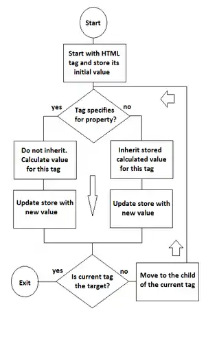 When the cascade has run its course, the original set of declared styles will have been reduced to a set of cascaded styles, but many properties will not have been declared in the first place. In order for the browser to function correctly there must be a single value for every property that is considered essential for that element's formatting. The browser fills these large gaps with its default actions. For each essential property that is missing, it first tries to inherit a suitable value from a parent element, that is, from the tags that surround it; if that is not possible for some reason, the browser assigns an initial value. Property Initial values are preset in Property Definition Lists, at design time. The result of applying these defaults is to make a comprehensive set of specified values, that includes every property that is needed, for each tag under consideration.