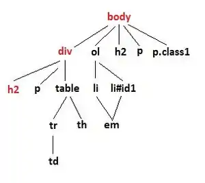 div table tr td p {color:red} /* for a paragraph in a cell of a row of a table in a division block */