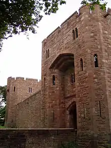 Sited on crag high above Cheshire Plain, 19th century outer gatehouse. |
