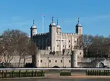 The Tower of London, or more properly, Her Majesty's Royal Palace and Fortress, stands on the north bank of the River Thames in central London. Construction began in 1066 shortly after the Norman invasion. The castle's common name comes from the White Tower which was built in 1078 and was seen at the time as a symbol of oppression. As a whole, the Tower is a complex of several buildings set within two concentric rings of defensive walls and a moat. There were several phases of expansion, mainly under Kings Richard the Lionheart, Henry III and Edward I in the 12th and 13th centuries. The general layout established by the late 13th century remains despite later activity on the site.