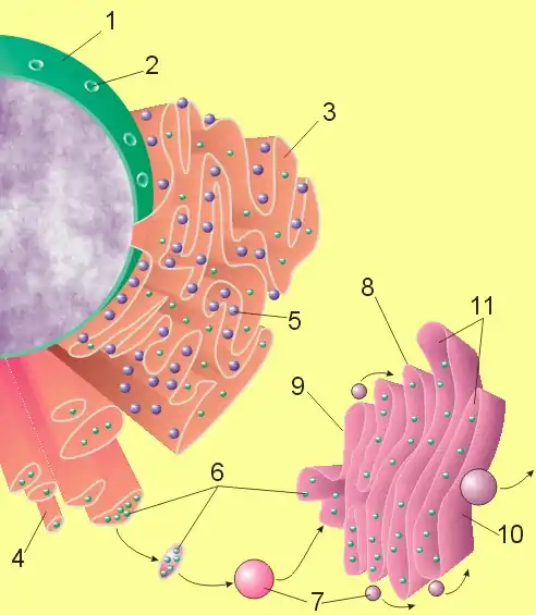 Parts of the ER are covered with ribosomes (which assemble amino acids into proteins based on instructions from the nucleus). Their rough appearance under electron microscopy led to their being called rough ER (RER), other parts are free of ribosomes and are called smooth ER (SER). The ribosomes on the surface of the rough ER insert the freshly produced proteins directly into the ER, which processes them and then passes them on to the Golgi apparatus (Fig. 1).