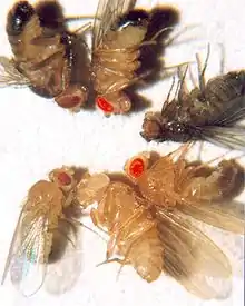 D. melanogaster types (clockwise): brown eyes with black body, cinnabar eyes, sepia eyes with ebony body, vermilion eyes, white eyes, and wild-type eyes with yellow body