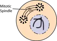 The other important piece of hardware in mitosis is the centriole, which serves as a sort of anchor. During prophase, the two centrioles - which replicate independently of mitosis - begin recruiting microtubules (which may be thought of as cellular ropes or poles) and forming a mitotic spindle between them. By increasing the length of the spindle (growing the microtubules), the centrioles push apart to opposite ends of the cell nucleus. It should be noted that many eukaryotes, for instance plants, lack centrioles although the basic process is still similar.