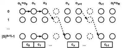 C = malloc( p * (l+k-1) * |S| ) # reserve memory for the counted amount of preimages # i = 0 # start with the first preimage for ( o=0; o<|S|^(k-1); o++ ) # for all overlaps for ( j=0; j<b_L[0][o]*b_R[0][o]; i++ ) # for each overlap the number of preimages is calcuated o_x[i] = o # i-th preimage path begins with overlap o i++ # to the next preimage end_for # end_for # if (cyclyc) # for bounded lattices there is no need to know the starting points o_L = o_R = o_x # copy the current array of overlap to the array of starting overlaps end_if # for ( x=0; x<l; x++ ) # run from the left to the right i = 0 # start with the first preimage while ( i< p ) # check if all preimages have been finished for ( c=0; c<|S|; c++) # check all links for each source overlap o_x[i] = (o_x[i]*|S|+c) / |S|^(k-1) # calculate the drain overlap elseif (bounded) # for bounded lattices w = b_R[x+1][o_x[i]] # the count from the drain node to the right end is used if (cyclic) # for cyclic lattices w = D_R[x+1][o_x[i],o_L[i]] # the count from the drain node to the end node (same as left) end_if # for ( j=0; j<w; j++ ) # use the count C[i][x+k-k0-1] = c # and write a cell for each of them i++ # increment the preimage counter end_for # end_for # end_while # end_for # end of algorithm