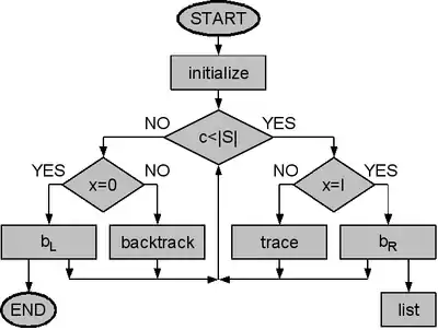 - when backtracking reaches the left boundary, the tracing restarts at the next valid node till all nodes are exhausted.