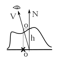 - Computation of the intersection of the viewing ray in direction of V with a surface at height parallel to the rendered surface. The distance is the distance between the rasterized surface point moved by in the direction of N and this intersection point. If these two points are projected onto the rendered surface, is also the distance between the rasterized point and a new point on the surface (marked by a cross in the illustration). This new surface point is a better approximation to the point that is actually visible for the view ray in direction V if the surface was displaced by the height map.