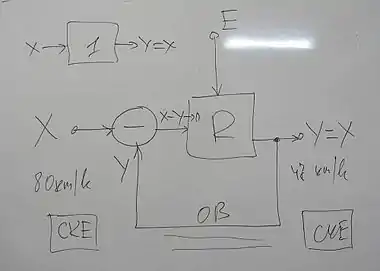 So, the simplest negative feedback follower consists of only three components: power (energy) source E, regulating element R and a subtractor (-).