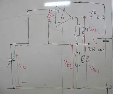 Firstly, let's remind what an operational amplifier (op-amp) is: it's a device having a differential input (it may be current, voltage, mechanical motion?!?Circuit-fantasist (talk) 18:09, 7 May 2008 (UTC), etc.) and the output that varies according to the input but with a larger amplitude. Almost always they are used with negative feedback (the output signal is returned to the input in opposite direction to the source signal). However, they may be also used with a positive feedback (the output signal that is returned is summed with the input original signal) but much rarely. For ideal OA in a negative-feedback circuit, the network returns a fraction of the output to the inverting input and thus makes the differential input voltage toward zero.