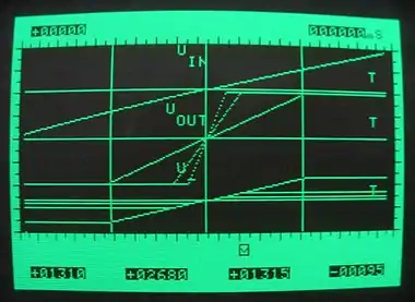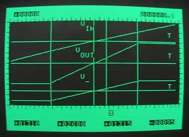 Transfer characteristic. Microlab can help us to obtain this curve on the screen. There is no time in this graphical presentation; there is only input and output quantities. We might discern three regions on this curve: negative saturation (large), active region (narrow) and positive saturation (large).