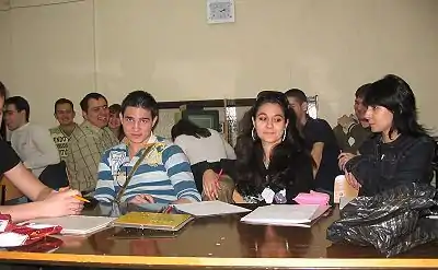 Well, your colleague begins drawing a diode; is she drawing it in the right direction? By the way, I know there are diodes that are usually connected in a reverse direction. What are they? Students: ...zener diodes... Right but let's use an ordinary diode. Only, let's connect it correctly... Is the circuit written correctly?