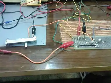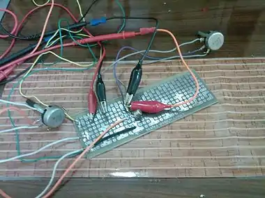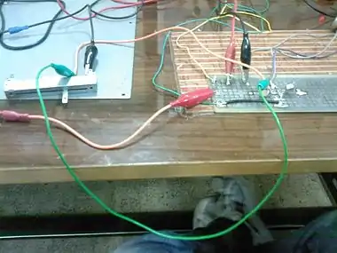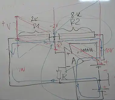In order to carry out Ohm's experiment, we needed some kind of resistive wire. Our teacher gave us a heater wire, so we start experimenting with it. When we connected it with conductors, power supply, voltmeter and an ammeter we start measuring its resistance. We were also using two kinds of voltmeters and ammeters - old-fashioned movement ones and new digital devices. After our successes in building and connecting the scheme, we were very excited to find it actually worked. The images around show our scheme and progress.