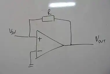 If we have voltages with different polarity and VIN1 and VIN2 are selected so that VOUT=0 (point known as "virtual ground") we have a comparing device,like in the scheme in the third picture:VIN2/VIN1 = -(r2/r1).To keep Vout = 0 we can use operational amplifier(down).Here I1.R1=(VIN/R1).R2 or VOUT/VIN=-R2/R1.
