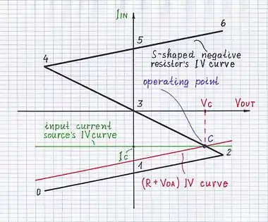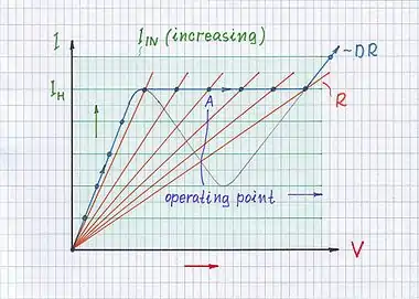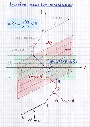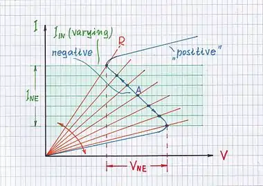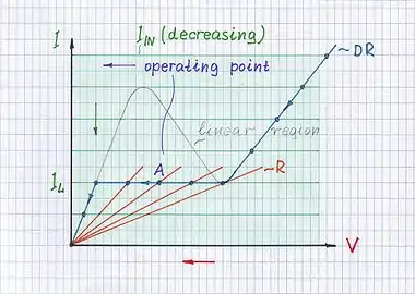 - ↑ The instant resistance in the negative resistance region can be modified in two manners: from high to low and v.v., from low to high. In the first case, the IV curve folds up counterclockwise and becomes S-shaped; in the second case, it folds up clockwise and becomes N-shaped.
