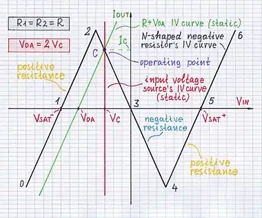 These circuits have constant ohmic resistance but different voltage in the three parts of their IV curves (when the input quantity varies from zero to maximum). In the middle part, the op-amp operates in active mode and manages to create negative resistance. The IV curve has a negative slope in the middle region and passes through the origin of the coordinate system; it can enter the 2nd and 4th quadrants as additional energy is supplied. This is to be compared with NDR devices such as the tunnel diode where the negative slope portion of the curve does not pass through the origin. In the end parts, the op-amp is saturated and the circuit behaves as a voltage source with internal resistance R.