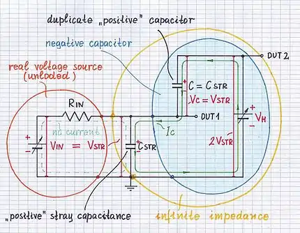 For example, the "positive" impedance of the stray capacitance CSTR (Fig. 10) consuming undesired current can be neutralized (made infinite) by connecting in parallel a negative capacitor with the same but negative capacitance. It is implemented by a "positive" capacitor with the same capacitance C = CSTR and a voltage source with redoubled voltage VH = 2VCstr. This negative capacitor eliminates the undesired current ICstr by producing the same current IC = ICstr. As a result, the stray capacitance does not consume any current from the input source as the negative capacitor does provide all the current needed to charge the stray capacitance. The op-amp implementation of this negative capacitor (Fig. 9) is just the negative impedance converter with current inversion (INIC) from Fig. 6 where the resistor R is replaced by the capacitor C.