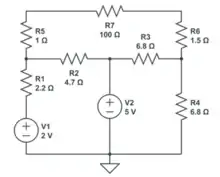Example, find the thevenin equivalent of this circuit, treating R7 as the load.