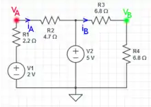 VA = 2-VR1 = 2 - (2-5)*2.2/(2.2+4.7) .. voltage divider