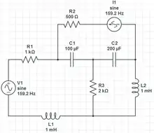 Complex 3R, 2L, 2C, voltage and current source circuit