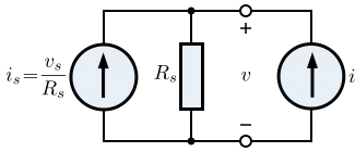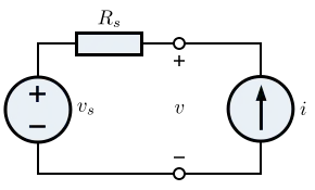 There are two variables, so two values of i will be needed. See Example 1 for more details. We can easily see from this that if the current source is set to zero (equivalent to an open circuit), then v is equal to the voltage source, vs. This is also called the open-circuit voltage, voc.
